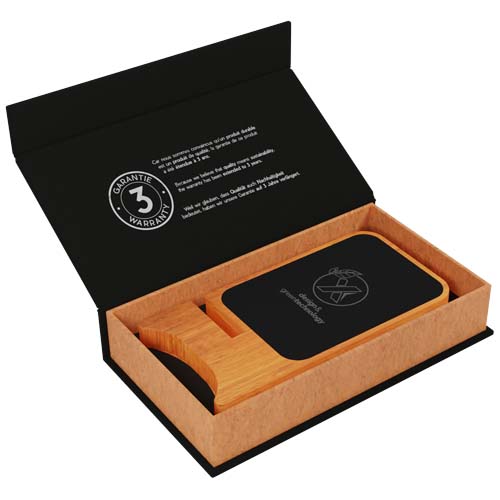 | Description | 10W wireless charger made of rubber and bamboo with antibacterial treatment and light-up logo. Type C input. Delivered in a black gift box made of recycled kraft paper including a recycled PET plastic cable. Patent EUROPE EUIPO. |