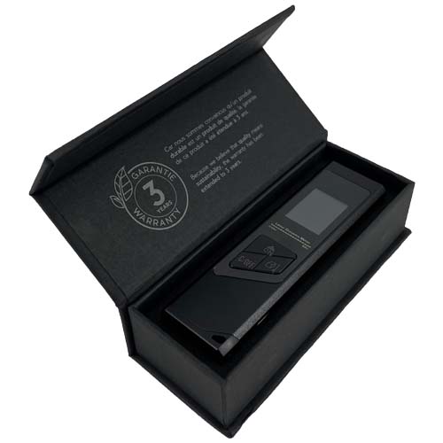The mini laser telemeter is an easier, faster and more accurate way to measure area, volume, and it also has a Pythagoras function. With its laser precision technology and real time measurement mode, it provides reliable measurements up to 40 meters. The telemeter uses an energy-saving 200mAh li-ion battery as power supply, and can measure distance 2000 times after fully charged. It has a backlit display for easy viewing even in dark areas. Size: 9 x 2.4 x 1.1 cm. Packed in a recycled paper gift box (10.2 x 4.2 x 3 cm) with magnetic closure. Includes 3 year warranty.