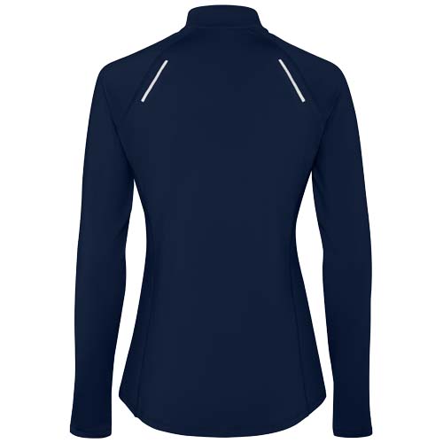 Long-sleeve technical raglan sweatshirt for women. Slim-fit. Collar with a half zip inverted design featuring reflective details. Reinforced seam covers. Cuffs with thumb openings. Reflective details on the back. Back hem slightly longer than the front. Warm brushed inner fabric.